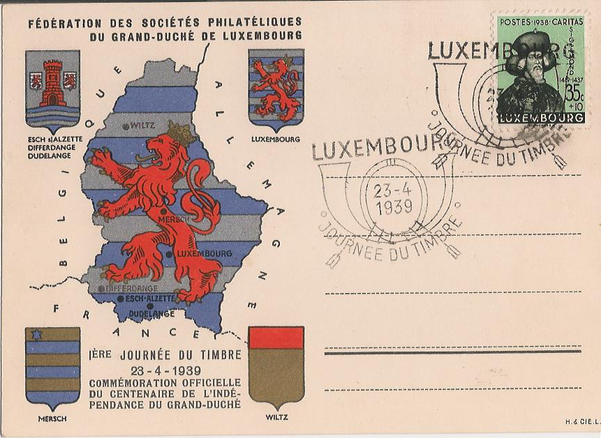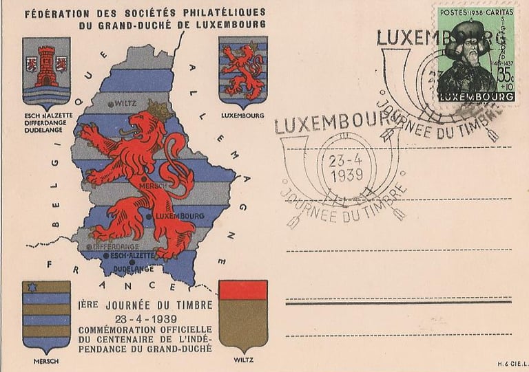 Dat philatelescht Element vun der Ausstellung weist eng ëmfangräich Sammlung un Timberen a Postenveloppen, dorënner vill mat raren oder ganz spezielle Gedenkstempelen – déi Tëntenofdréck, déi wichteg biergerlech oder historesch Occasioune markéieren.