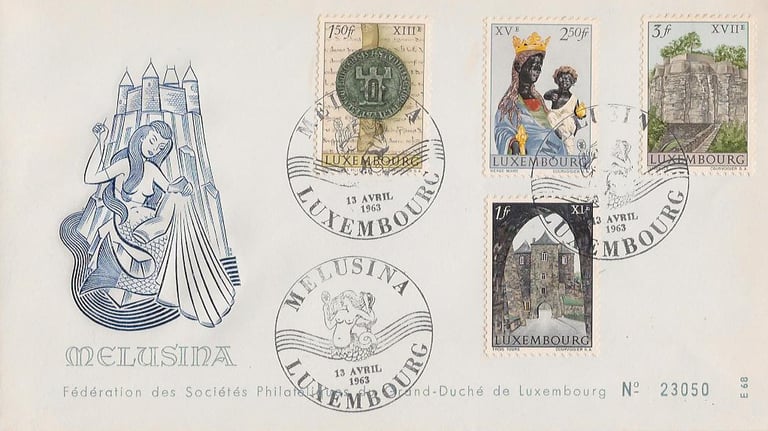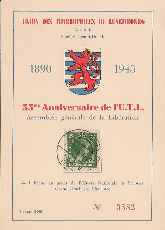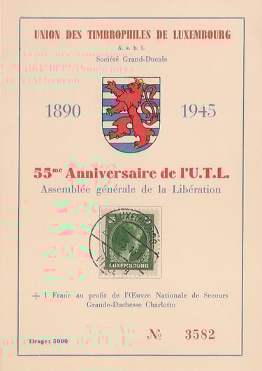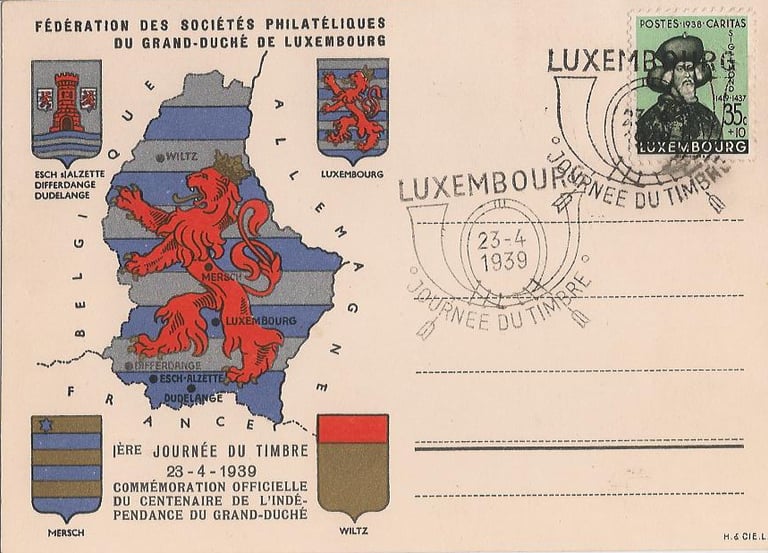 Dat philatelescht Element vun der Ausstellung weist eng ëmfangräich Sammlung un Timberen a Postenveloppen, dorënner vill mat raren oder ganz spezielle Gedenkstempelen – déi Tëntenofdréck, déi wichteg biergerlech oder historesch Occasioune markéieren.